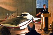 Michael P. Roberts ’11, captain of the MIT Solar Electric Vehicle Team, unveils the team’s latest solar car, named Eleanor, on Feb. 27. The car competed in the 2009 World Solar Challenge in October, placing second in the “Silicon Class” and fifth overall out of 38 teams in the 3,021 kilometer race.