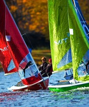Members of the MIT Sailing Team (sail 3) exit a turn behind Boston College (sail 13) during the Erwin Schell Trophy on Nov. 1 on the Charles River. The sailing competition featured 20 collegiate and military teams from across the Northeast.