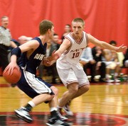 Nicholas R. LaBounty ’09 looks down for a pass in a game against New England College on Jan. 17, 2009.