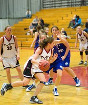 Erica N. Pino ’13 drives around a U.S. Coast Guard Academy defender in the first half of the women’s basketball game on December 2. The engineers were defeated 47-38.