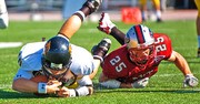 Defensive back Corey Garvey ’10 makes a key tackle in the Sept. 19 game against Framingham State at Steinbrenner Stadium.
