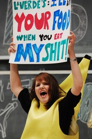Tess E. Wise ’10 parodies the recent dining protest in Lobby 7 in a skit making fun of east and west campus stereotypes during the nth Annual Concert in Bad Taste, put on by the Chorallaries of MIT on Saturday night.