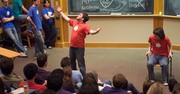Matthew A. “Baking Chocolate” Ciborowski G (center) and Brian T. “Questions” Basham ’12 (right) perform a scene in a “triple dub” format, in which each of three characters speaks for another person, at the Roadkill Buffet’s improvisational comedy show Saturday evening in 6-270.