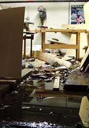After a weekend of non-stop rain, large puddles and waterlogged debris have turned the machine shop at East Campus into a soggy mess. See article, page 13.