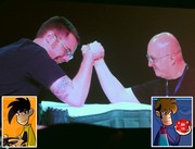 In response to a request from the audience, Penny Arcade creators Mike Krahulik (left) and Jerry Holkins arm wrestle. After an overly dramatic minute, Krahulik won.