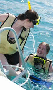 From left: Kelly A. Strominger ’10 and Deborah C. Markham ’10 board the boat after snorkeling in the South West Bay off Nassau, The Bahamas on Tuesday, March 23.