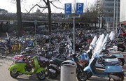 Motorcycles and bicycles are parked outside of Centraal Station in Amsterdam.