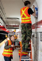 Maxwell Mann ‘12 observes as Nathan Lachenmyer ‘10 works to free the drive chain from the bell at the Kendall Red Line station. The MIT Kendall Band Preservation Society began their work repairing and refurbishing the Paul Matisse musical sculpture yesterday.