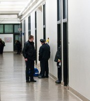 MIT Police examine the area on the first floor of Building 2, where the incident took place.