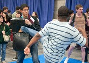 A member of the MIT Sport Taekwondo team holds a pad while a prospective freshman gives it a solid kick.