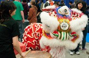 MIT Lion Dance Club members bang on drums and demonstrate Chinese lion dancing during the CPW Festival in Johnson.