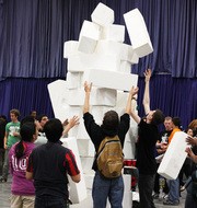 Prefrosh attempt to rebuild a giant foam Jenga tower, but to no avail.