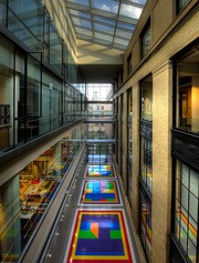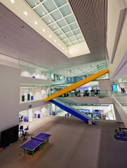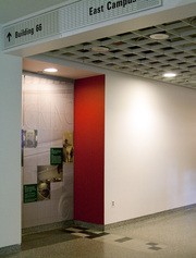 Colored walkway: The spectacular walkway between Buildings 6C and 8 reflects colors in the afternoon. Building 6C was completed in 2007. It houses physics and materials science labs.