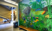 Jungle mural: A variety of tropical animals greet visitors to MIT’s Hayden Memorial Library in Building 14.