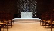 MIT chapel: MIT’s non-denominational chapel, designed by Eero Saarinen, lies across from Kresge Auditorium. The metal sculpture behind the altar catches reflected light from the moat to provide ambient lighting inside.