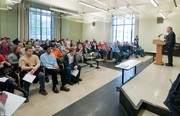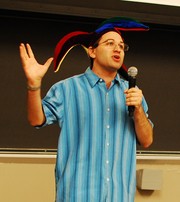 Course 6 professor Scott Aaronson persuades prefrosh to join the electrical engineering and computer science department at the during the second annual Professor Talent Show on Saturday. Professor Aaronson was voted the winner of the event for his fast-paced and hilarious presentation.