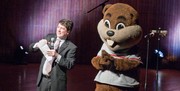 Admissions officer Matthew L. McGann ’00 and Tim the Beaver entertain prefrosh and parents during CPW’s closing remarks and variety show in Kresge auditorium on Saturday night.