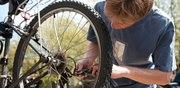 Cimarron J. L. Wortham G adjusts the rear derailleur of a bicycle brought to a free bicycle repair clinic held on the steps outside of the Stratton Student Center on Thursday. The clinic, held every year on Earth Day, was organized by Katherine E. Potter G and staffed with volunteer bicycle mechanics.