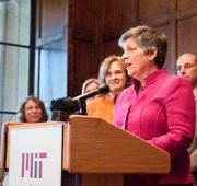Secretary of Homeland Security Janet Napolitano speaks in the Emma Savage Rogers Room (10-340) last Friday. Napolitano met with the heads of Boston-area universities at MIT to discuss how national security can be aided by higher education.