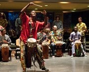 Lamine Touré of MIT Rambax, a Senegalese drumming ensemble, leads a group of more than thirty MIT students during the group’s concert in Lobdell on Sunday.