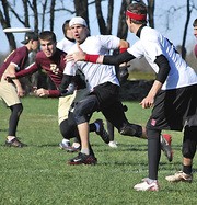 Ethan F. Gillett G throws to Brian J. Munroe G in the Metro Boston sectionals. With the win, the men’s ultimate frisbee team secured a bid to the New England regional tournament in May.