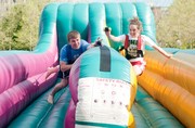 Sean D. Fannin ’13 and Jordan Lyday dive and struggle against their bungee-cord harnesses to get their velco marker further along the centerline at the Greek Week(end) 2010 carnival held by Panhel/IFC on Kresge lawn on Friday. Tickets given out at the front could be used for food or a number of events, and the Greek Week(end) team which ran each station received credit toward their team’s total. Greek weekend teams are made up of a combination of fraternities and sororities. The winning team selects which charity receives all the proceeds from the weekend.