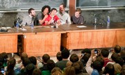 Panelists Jamie Wilkinson and Kenyatta Cheese (Know Your Meme), Greg Rutter (Youshouldhaveseenthis.com), and Christopher “moot” Poole (4chan) show Ben Huh (I Can Has Cheezburger?) some love during the Mainstreaming the Web panel of ROFLcon after Ben said, with regard to ROFLCon, “I feel like I’m part of something special.” ROFLCon, a two day conference on Internet culture, took place last Friday and Saturday on campus.