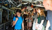 Students eagerly explore the insides of a MV-22 Osprey. The tilt-rotor helicopter landed on Briggs Field and visited other Boston landmarks on Monday as part of Marine Week Boston.