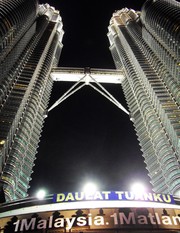 The Petronas Towers at night in Kuala Lumpur, Malaysia. The Petronas towers are the tallest twin buildings in the world, standing at 1482.6 feet.