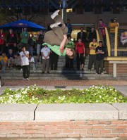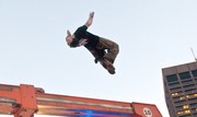 Michael Turner, one of eight athletes featured in MTV’s Ultimate Parkour Challenge, does a roll over a small patch of grass in City Hall Plaza.