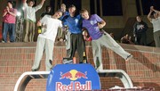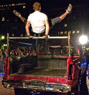 Patrick Bryan throws a gymnastics-inspired trick on the back of a pickup truck after learning it just ten minutes before the beginning of the competition.