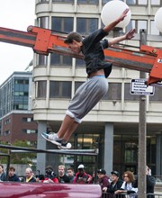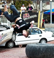 Marcus Gustafsson of Sweden practices his flip over two prop newspaper boxes filled with luggage bags an hour before the competition.