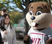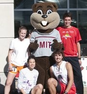 The winners of the Beaver Dash, (left to right) Kaitlin R. Goldstein G (1st place, women), Donna M. Golach ‘12 (2nd place, women), Scott T. Landers (2nd place, men), and Antonio Tugores-Garcia G (1st place, men), pose with Tim the Beaver after their race.