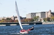 Neil T. Forrester ’12 steadies his boat during the 18th Annual Brass Rat Regatta on Saturday morning. Over 30 current and former members of MIT Sailing showed up for the race.