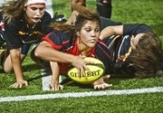 Forward Captain Marisa “Hot Sauce” Jasso ’13 (wearing red) scores a try for the Engineers in their match against Wentworth Institute of Technology in last Friday’s game. The Engineers, who won the national championship last year, crushed Wentworth 43-9.
