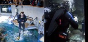 Linus Torvalds, the creator of the open source Linux operating system, dives into the shark tank at the New England Aquarium on Wednesday night. Torvalds was given a choice between giving a keynote presentation at the Linux Plumbers conference and being fed to the sharks, and he chose to jump in. (See page 13.)