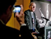 President Susan J. Hockfield spoke Friday about the uniqueness of the MIT community and thanked the MIT 150 steering committee for their work in putting together the MIT 150 exhibit. The exhibit floor at the MIT Museum was packed with students, alumni, and faculty. There were 657 people in the exhibit by the end of the speeches.