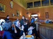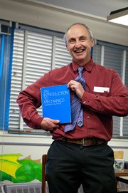 Peter Dourmashkin, outgoing lecturer and an associate director of the Experimental Study Group, poses with the textbook he used while teaching 8.012 at ESG. After a 28-year tenure with ESG, Dourmashkin, who was also one of the principal investigators of the TEAL program, will continue to work in Physics Department. The ESG community held an appreciation party for Dourmashkin on Tuesday, Jan. 11.