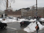 Rush hour traffic and pedestrians cross the railroad tracks that border MIT’s campus where they intersect Massachusetts Avenue. The Massachusetts Bay Transit Authority is considering upgrading these rails for commuter rail use, which would lead to increased train traffic at busy intersections like this one.