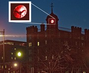 Hackers installed a red backlight and the shadow of a phoenix behind the clock adorning Maseeh Hall’s west tower. This fall, the Phoenix Group will help populate Maseeh Hall. Barely visible in daylight, the hack was obvious after sunset on Sunday evening.