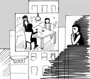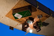 For Campus Preview Weekend 2010, hackers installed a high-class lounge (complete with pool table, sleeping cat, whiskey, and hack plans) upside down on the Media Lab Arch on the morning of April 8.