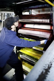 Workers at Mass Web adjust levers on each color press so ink is fed onto rollers such that each page receives sufficient but not excessive amounts of ink across the span of the printing plate.