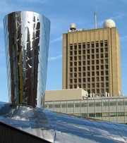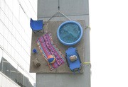 Hackers, to commemorate last year’s “Inverted Lounge” CPW hack, installed a “Verted Lounge” on the side of the Media Lab arch. Last year’s lounge was tied around a classy theme, complete with pool table, leather chairs, a sleeping cat, and a working lamp fixture. This year, the hackers appear to have moved to a beach, with a beach chair, a sandcastle-esque dome, a beach towel, and a special reprise from the sleeping cat.