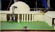 The theme of this year’s 2.007 (Design and Manufacturing I) competition was “MIT’s Greatest Hacks” in honor of the Institute’s 150th anniversary. The four tasks that the teams’ robots had to complete were placing a police car on the dome, pulling the Caltech cannon, dropping five bouncing balls, and inflating a weather balloon on the Harvard football field.