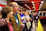 Paul Matisse, the artist behind the Pythagoras musical sculpture in the Kendall T station, attends the Kendall Band re-installation ceremony on April 30. In 2010, the MIT Kendall Band Preservation Society embarked on a 13-month restoration project to repair the hanging set of hammers and chimes.