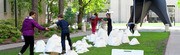 Visitors play in the Gradated Field, one of the many FAST installations on campus. The Gradated Field is a collection of smooth, white plaster mounds formed by latex sheets. Visitors are encouraged to wander and lounge amongst the art.