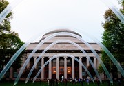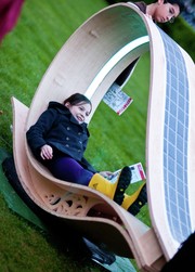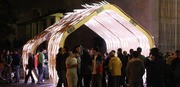 Visitors explore the Unflat Pavilion/Feather-Weight House, a freestanding pavilion constructed from laminated plywood. The inside of the structure is illuminated with flexible LED strips. It was created by Nick Gelpi, a lecturer in the Department of Architecture.