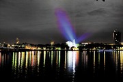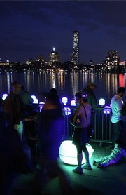 Visitors mingle around Light Drift by Professor of Architecture J. Meejin Yoon. The color-changing orbs encouraged people to interact with each other and with the river, as touching the orbs on land affected the colors of the orbs in the water.