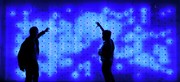 Kaustuv K. De Biswas G and Daniel Rosenberg G, the developers of Maxwell’s Dream: Painting with Light, stand in front of their creation. Over 600 exhibit visitors played with a magnetic field to create light on May 8.