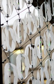Wind Screen, installed by Professor of Architecture J. Meejin Yoon for the MIT150 FAST Arts Festival, is on display in the archway below the Green Building. Each subunit is a wind turbine and generates all the energy it needs to light up as it spins. As the wind blows harder, the turbines spin faster and light up more brightly.